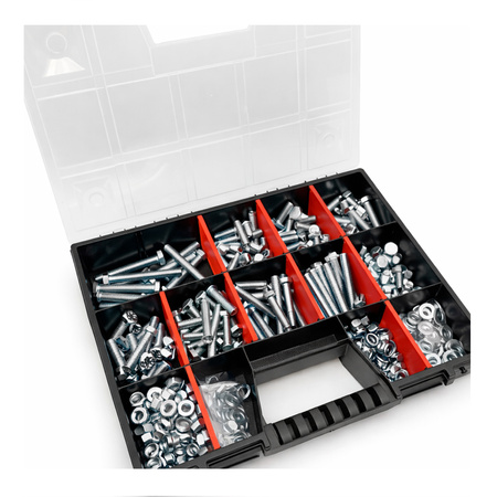 Ten zestaw zawiera najpopularniejsze rodzaje śrub, nakrętek oraz podkładek, dzięki czemu zawsze będziesz mieć pod ręką ten element, którego akurat potrzebujesz. To nie wszystko. Złącza zapakowaliśmy w poręczną, przenośną i wytrzymałą skrzynkę, której możesz użyć zawsze, do innych narzędzi i akcesoriów modyfikując dowolnie jej przegrody.