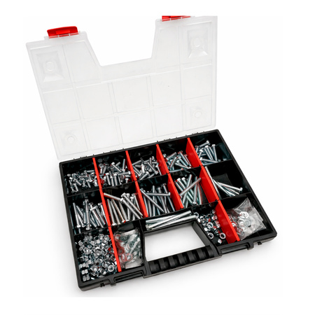 Ten zestaw zawiera najpopularniejsze rodzaje śrub, nakrętek oraz podkładek, dzięki czemu zawsze będziesz mieć pod ręką ten element, którego akurat potrzebujesz. To nie wszystko. Złącza zapakowaliśmy w poręczną, przenośną i wytrzymałą skrzynkę, której możesz użyć zawsze, do innych narzędzi i akcesoriów modyfikując dowolnie jej przegrody.