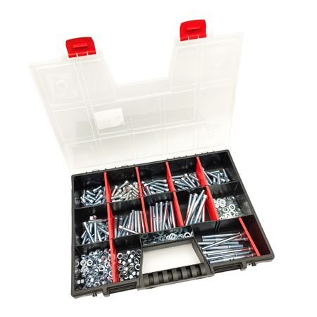 Ten zestaw zawiera komplet śrub z gniazdem sześciokątnym M8 o różnych długościach oraz różnego rodzaju nakrętki i podkładki z tym samym rozmiarem gwintu, dzięki czemu zawsze będziesz mieć pod ręką pasujące do siebie elementy. Ale to nie wszystko. Złącza zapakowaliśmy w poręczną, przenośną i wytrzymałą skrzynkę, której możesz użyć również do innych narzędzi i akcesoriów modyfikując dowolnie jej przegrody.