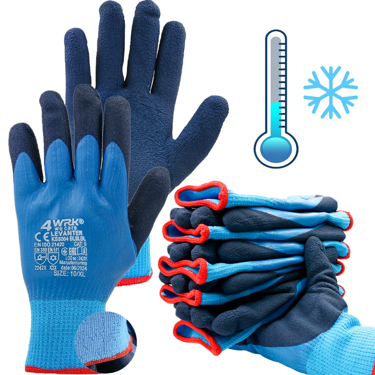 ❄️Wodoodporna powierzchnia dłoni: Powłoka z lateksu oraz pianki lateksowej na dłoni zapewnia dobrą przyczepność oraz odporność na wilgoć, co zwiększa komfort i bezpieczeństwo pracy w mokrych warunkach.