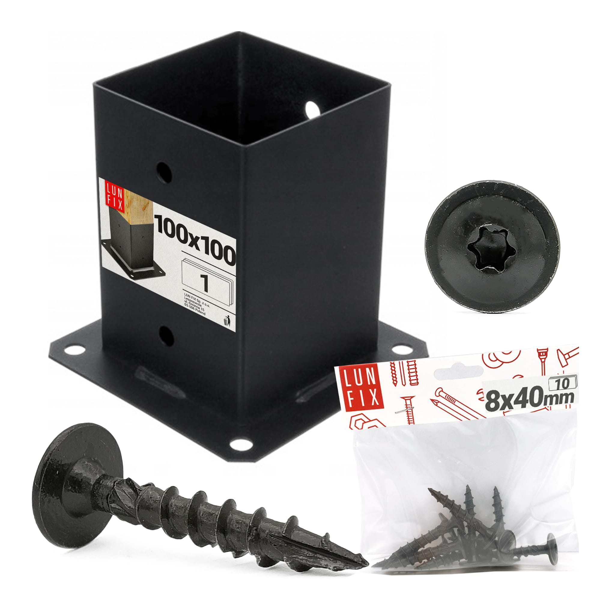 Zestaw montażowy: czarna podstawa słupa + wkręty – nowoczesne, estetyczne i stabilne mocowanie. Zobacz, dlaczego warto wybrać ten komplet: